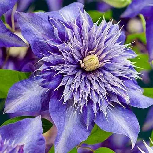 Листья у клематиса продолговатые, с острыми кончиками, матовые, темно-зеленые, могут достигать длины 10 см. Листья на растении появляются рано, практически сразу с приходом тепла. Молодые черешки (основания листьев) обычно темно-зеленого цвета, но со временем темнеют и становятся коричневыми. Цветы образуются на перезимовавших побегах прошлого года, а также на молодых побегах. Цветы клематиса данного сорта махровые или полумахровые. Они имеют от 4 до 8 наружных лепестков, плоских, округло-продолговатых, с прожилками, острыми кончиками и легким опушением нижней стороны. Центральная область окружена несколькими рядами укороченных игольчатых или ланцетовидных лепестков, торчащих вертикально. Форма внутренней части цветков варьирует в пределах сорта. Окраска лепестков также может быть от сине-фиолетового до голубого. Тычинки желтоватые, с красным или розовым оттенком. Полностью раскрытые цветы могут достигать 20 см в диаметре.