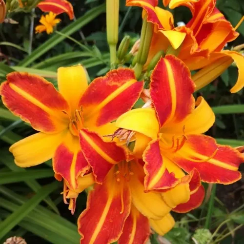 Цветы у Франс Халс крупные — до 14 см в диаметре, с чёткой, графичной двухцветной окраской: внешние лепестки — солнечно-жёлтые, как летний день в зените, а внутренние — насыщенно-красные, прорезанные яркой золотистой жилкой. Такое сочетание оттенков смотрится динамично, как всплеск огня среди зелени. Цветок простой по форме, но благодаря контрасту и размеру выглядит как художественный мазок на живом полотне сада.